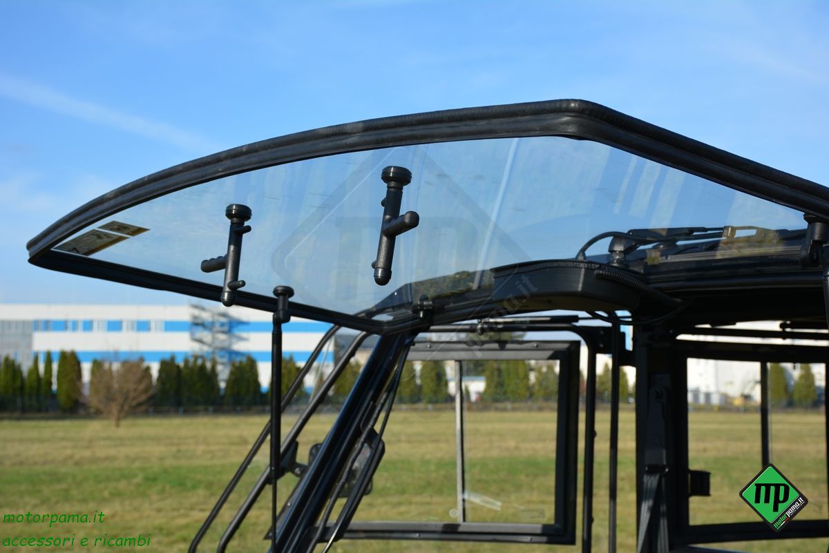 - Dettaglio vetro anteriore: Il parabrezza è realizzato in vetro di sicurezza temprato laminato, caratterizzato dalla funzione di inclinazione in due posizioni, assistita da due pompanti idraulici. Fissato al tettuccio di protezione con un sistema di bloccaggio in metallo, si blocca in due posizioni per favorire l'ingresso dell'aria.