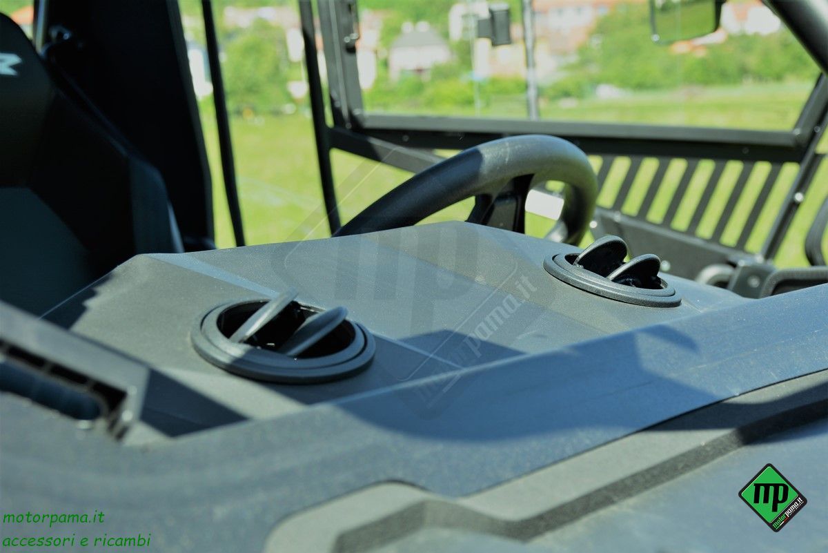 - Dettaglio vetro anteriore: Il parabrezza è realizzato in vetro di sicurezza temprato laminato, caratterizzato dalla funzione di inclinazione in due posizioni, assistita da due pompanti idraulici. Fissato al tettuccio di protezione con un sistema di bloccaggio in metallo, si blocca in due posizioni per favorire l'ingresso dell'aria.