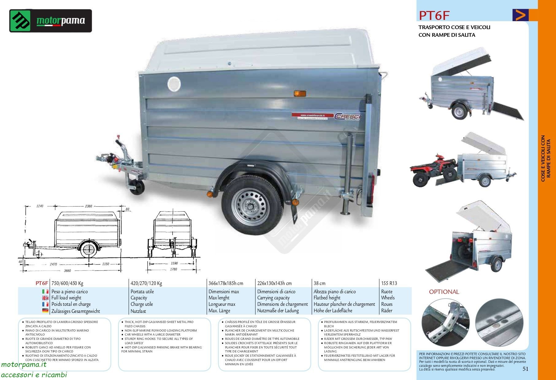 Carrello PT6F Cresci: Comodo, pratico, affidabile e resistente rimorchio con pedana / rampa di salita e copertura di protezione adatto al multiuso e al trasporto di: quad, scooter, moto, motocicli, moto cross, tagliaerba, ed altri mezzi. PRINCIPALI CARATTERISTICHE • freno a repulsione meccanica con sblocco autoreverse per retromarcia • sospensione a barra di torsione su gomma a ruote indipendenti • piano di carico in multistrato marino antiscivolo • telaio profilato di lamiera grosso spessore zincata a caldo • ruote di grande diametro di tipo automobilistico • impianto luci a nuova normativa comprensivo di retromarcia • ruotino di stazionamento zincato a caldo con cuscinetto per minimo sforzo in alzata • robusti ganci ad anello per fissare con sicurezza ogni tipo di carico Lunghezza max 366 cm Larghezza max 178 cm Altezza 185 cm Dimensioni utili di carico 226 x 130 x 143 cm Altezza sponde 112 cm Altezza piano di carico 38 cm Ruote 155R13 Peso a pieno carico Seleziona la portata per scoprirlo Peso a vuoto Seleziona la portata per scoprirlo Portata utile Seleziona la portata per scoprirlo