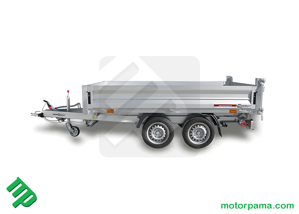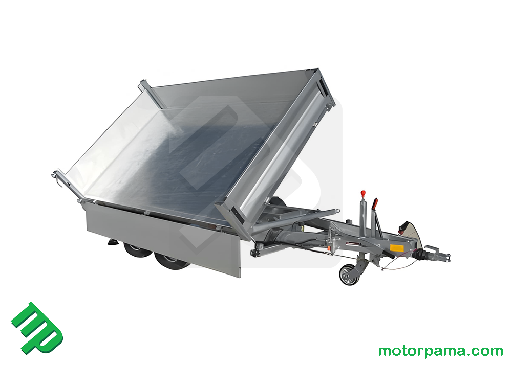 Carrello / rimorchio Cresci Rimorchi RB27 dodato di cassone posteriore ribaltabile trilaterale (su entrambi i lati e posteriormente) elettroidraulico e sponde apribili o smontabili alte 35cm. Ideale nell' ambito edilizio ed agricolo.