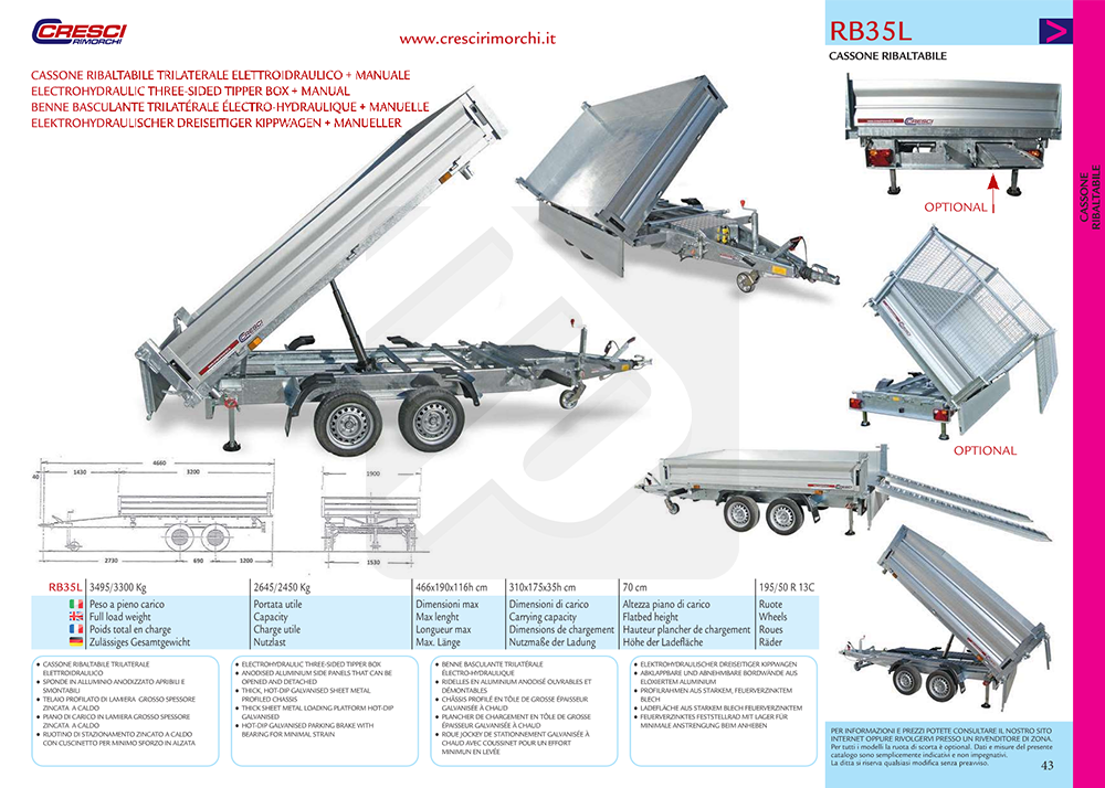 Carrello / rimorchio Cresci Rimorchi RB30 dotato di cassone posteriore ribaltabile trilaterale (su entrambi i lati e posteriormente) elettroidraulico e sponde apribili o smontabili alte 35cm. Ideale nell' ambito edilizio ed agricolo.