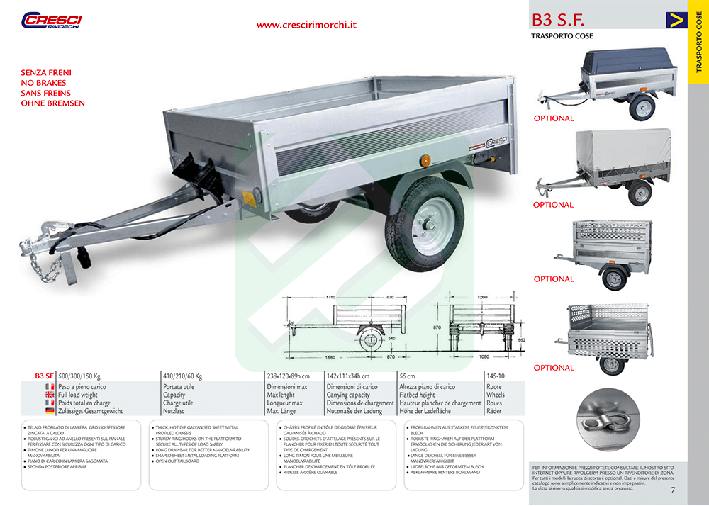 Carrello / rimorchio Cresci Rimorchi B3 SF senza freni, adatto al trasporto di cose.